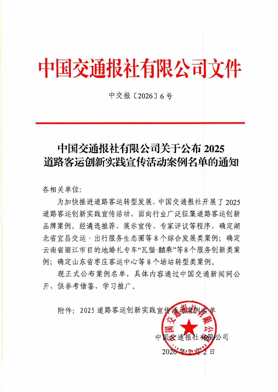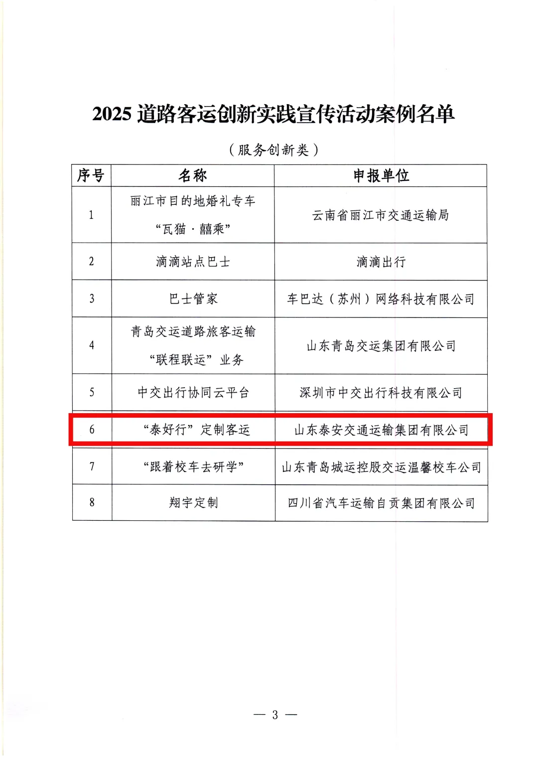 近日,中国交通报社发布2025道路客运创新实践宣传活动案例名单,泰安交运集团“‘泰好行’规模发展定制客运”实践成果成功入选,荣获全国道路客运创新实践优秀案例,成为全国道路客运转型发展的标杆之一。